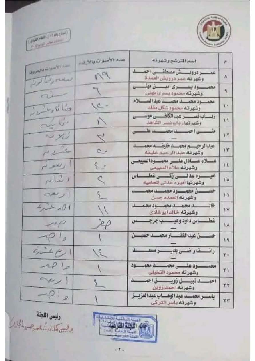 وبعد اعلان نتيجة العدد الحصري لأصوات المرشحين ، تقدم بعض المرشحين بتظمات إلي الهيئة الوطنية للإنتخابات نتيجة رصد أخطاء حسابية جسيمة وتعارض وتناقض في أرقام الحصر العددي المعلن لأصوات الناخبين في عدد من اللجان الإنتخابية ، مقارنة مع حصر الأصوات الفعلية المدونة بمحضر الفرز ، وطالب بعض المرشحين بإلغاء نتائج تلك اللجان لما شابها من أخطاء حسابية جسيمة تؤدي لبطلان تلك اللجان وبالتالي تؤثر في عدد الأصوات الحاصل عليها المرشحين مما يترتب عليه خروج بعض المرشحين من سباق جولة الإعادة ودخول أخرين جولة الإعادة .