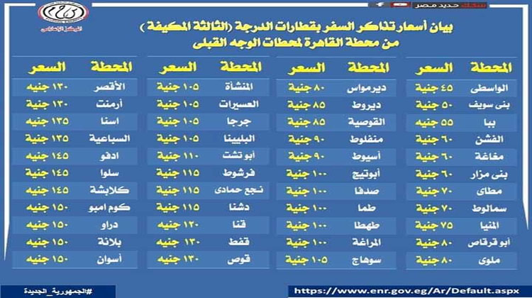 وفيما يلي بيان بأسعار التذاكر وفق ما أعلنته وزارة النقل، وهيئة سكك حديد مصر.
