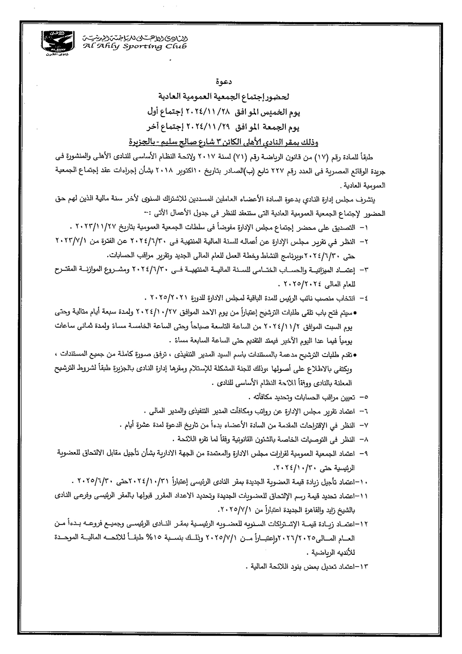 قرر الكابتن محمود الخطيب رئيس مجلس إدارة النادي الأهلي،وأعضاء المجلس، بتوجيه الدعوة لجميع الأعضاء العاملين المُسددين للإشتراك السنوي لآخر سنة مالية، الذين يحق لهم الحضور،وذلك من أجل إجتماع الجمعية العمومية العادية، يوم الخميس الموافق 28/11/2024 كإجتماع أول، ويكون الجمعة الموافق 29/11/2024 إجتماعاً ثانياً، وذلك بمقر النادي بالجزيرة للنظر في جدول الأعمال الآتي:-