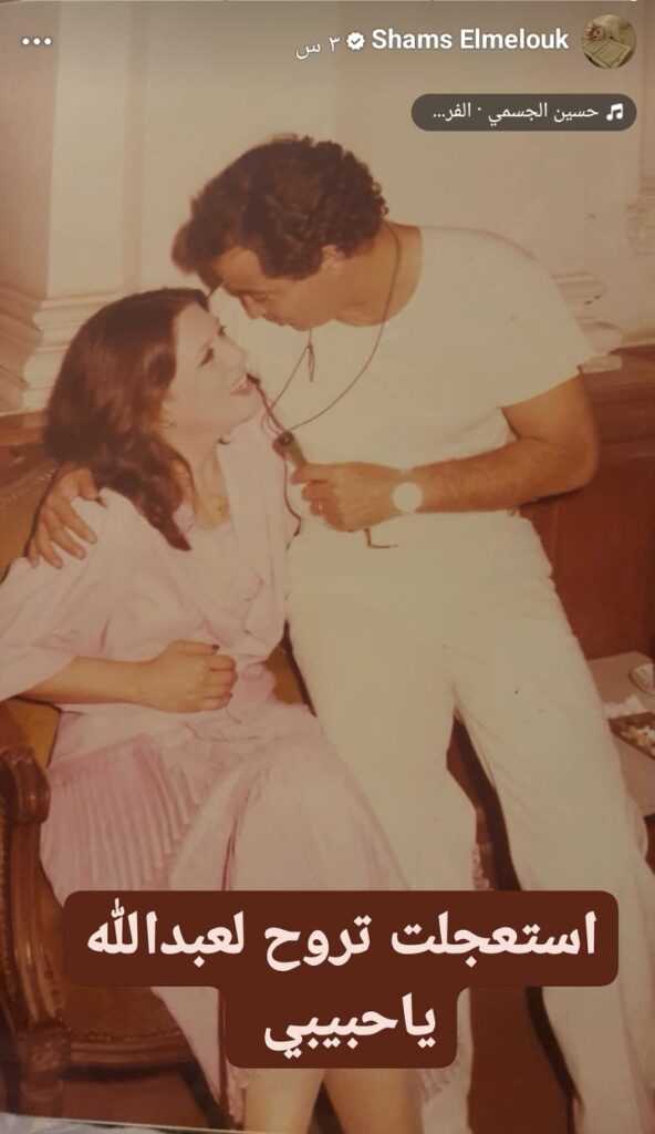 وكتبت الفنانة شمس البارودي، على الصورة قائلة: استعجلت تروح لعبدالله ياحبيبي، وذلك معبراً عن اشتياقها الكبير لزوجها، مسترجعة صورة من حياتهما الأسرية التي جمعت بينهما.