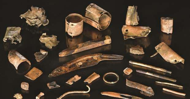 من بين أبرز الاكتشافات، أكثر من 25 قطعة برونزية محفوظة بشكل استثنائي داخل الطبقة الطينية العليا، مما منع الأكسدة، تشمل هذه القطع فؤوسًا مجوفة، ورؤوس رماح، وشظايا، وحلقات، ودبوسًا، ومنجلًا ، جميعها تحتفظ ببريقها المعدني، ويبرز قرص برونزي مثقوب يحمل رمزًا شمسيًا كاكتشاف فريد.