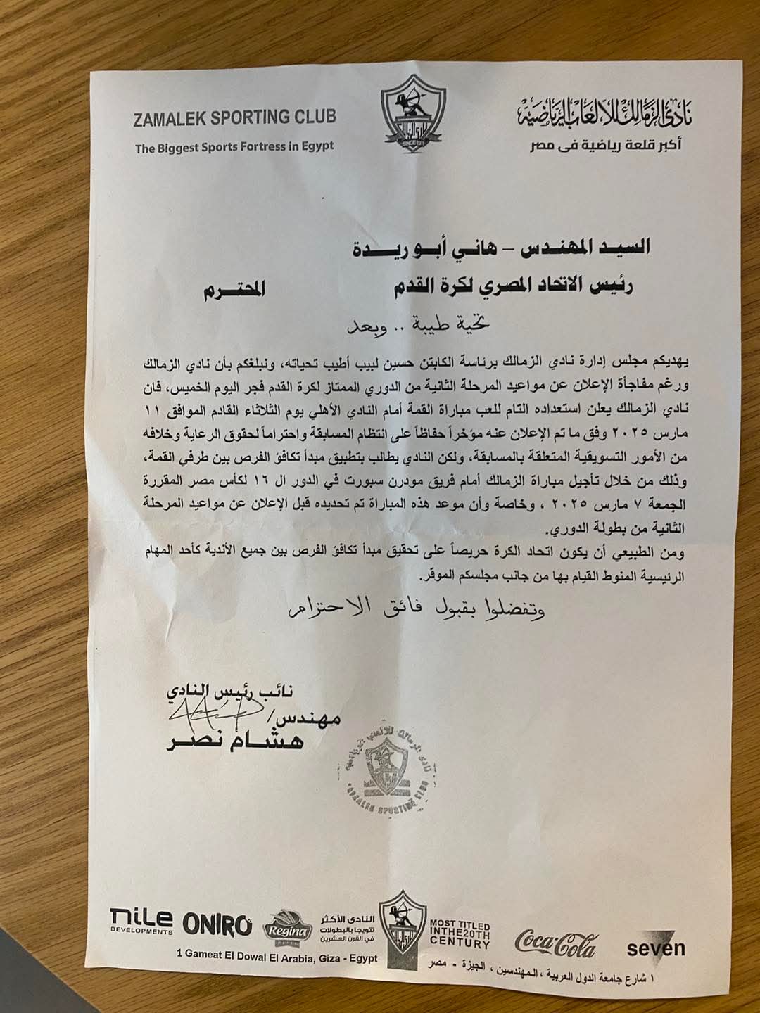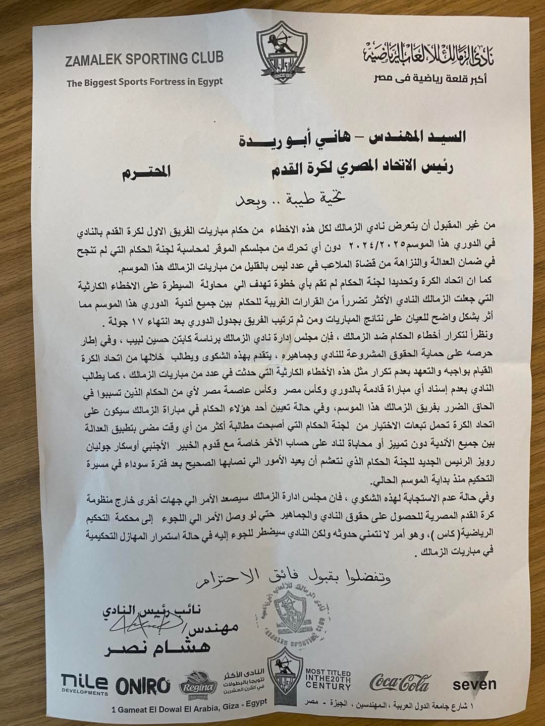 ونظراً لتكرار أخطاء الحكام ضد الزمالك ، فإن مجلس إدارة نادي الزمالك برئاسة كابتن حسين لبيب ، وفي إطار حرصه على حماية الحقوق المشروعة للنادي وجماهيره ، يتقدم بهذه الشكوى ويطالب خلالها من اتحاد الكرة القيام بواجبه والتعهد بعدم تكرار مثل هذه الأخطاء الكارثية التي حدثت في عدد من مباريات الزمالك ، كما يطالب النادي بعدم إسناد أي مباراة قادمة بالدوري وكأس مصر وكأس عاصمة مصر لأي من الحكام الذين تسببوا في الحاق الضرر بفريق الزمالك هذا الموسم، وفي حالة تعيين أحد هؤلاء الحكام في مباراة الزمالك سيكون على اتحاد الكرة تحمل تبعات الاختيار من لجنة الحكام التي أصبحت مطالبة أكثر من أي وقت مضى بتطبيق العدالة بين جميع الأندية دون تمييز أو محاباة لناد على حساب الآخر خاصة مع قدوم الخبير الأجنبي أوسكار جوليان رويز الرئيس الجديد للجنة الحكام الذي نتعشم أن يعيد الأمور الى نصابها الصحيح بعد فترة سوداء في مسيرة التحكيم منذ بداية الموسم الحالي، وفي حالة عدم الاستجابة لهذه الشكوي ، فان مجلس ادارة الزمالك سيصعد الأمر الي جهات أخرى خارج منظومة كرة القدم المصرية للحصول على حقوق النادي والجماهير حتي لو وصل الأمر الي اللجوء إلى محكمة التحكيم الرياضية ( كاس ) ، و هو أمر لا نتمني حدوثه ولكن النادي سيضطر للجوء إليه في حالة استمرار المهازل التحكيمية في مباريات الزمالك.
