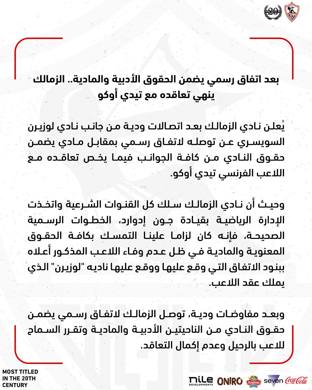 ونشر المركز الإعلامي لنادي الزمالك بيان يفيد: يعلن نادي الزمالك بعد اتصالات ودية من جانب نادي لوزيرن السويسري عن توصله لاتفاق رسمي بمقابل مادي يضمن حقوق النادي من كافة الجوانب فيما يخص تعاقده مع اللاعب الفرنسي تيدي أوكو.