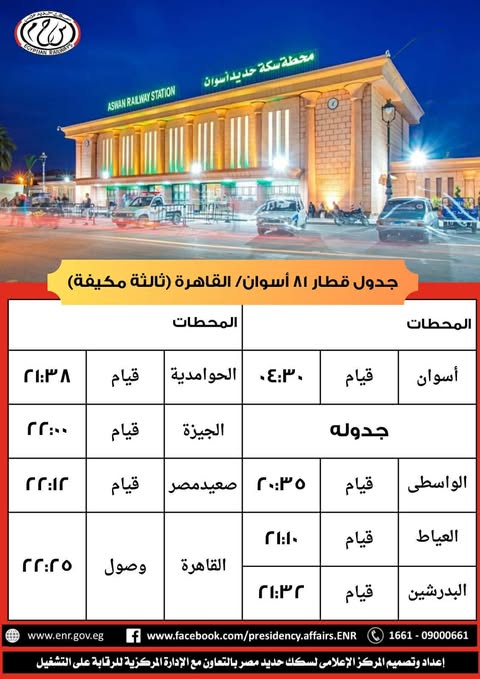 أعلنت الهيئة القومية لسكك حديد مصر إعتبارا من يوم السبت الموافق ١٠ / ١ / ٢٠٢٦ امتداد مسير قطار ٩٢٦ ثانية فاخرة من الاسكندرية حتى سوهاج ليصل الساعة ١٣:٣٥ ، على ان يعود من سوهاج بقطار ٩٢٩ الساعة ١٥:٣٠ لينتهى بالقاهرة ، ويترتب على ذلك تعديل مسير قطارى ٨١و٧٢٣ .
