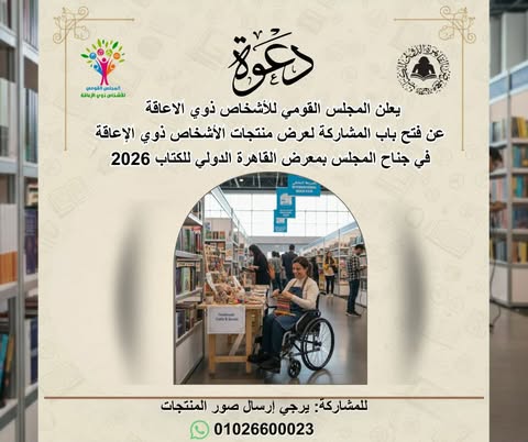 أعلن المجلس القومي للأشخاص ذوي الإعاقة عن فتح باب المشاركة أمام الأشخاص ذوي الإعاقة، والجمعيات العاملة في مجال الإعاقة لعرض منتجاتهم الفنية والحرفية والتراثية في جناحه الخاص بمعرض القاهرة الدولي للكتاب 2026، يأتي ذلك في إطار جهوده المستمرة لدعم وتمكين الأشخاص ذوي الإعاقة، وإتاحة الفرصة أمام المبدعين وأصحاب المشروعات والحرف اليدوية لعرض منتجاتهم أمام جمهور واسع.