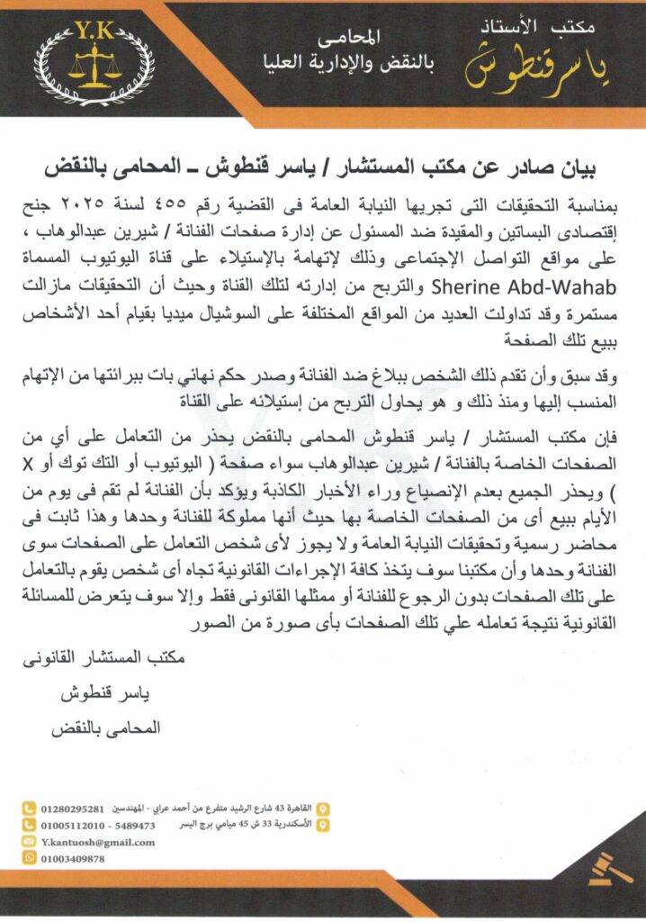 أصدر المستشار ياسر قنطوش، المحامي الخاص بالفنانة شيرين عبد الوهاب، بياناً صحفياً يمنع التعامل مع حساباتها الرسمية دون إذن مسبق، نظراً لعدم الفصل في القضايا المتعلقة بها حتى الآن.