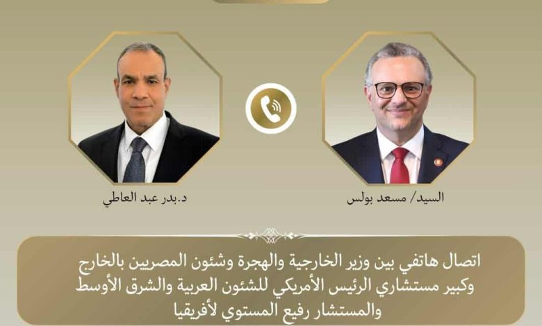 كشفت وزارة الخارجية المصرية، عن إجراء إتصال هاتفي هام مع مسعد بولس، كبير مستشاري الرئيس الأمريكي للشئون العربية والشرق الأوسط والمستشار رفيع المستوي للشئون الأفريقية، وذلك لبحث تطورات الأوضاع في كل من السودان وليبيا.