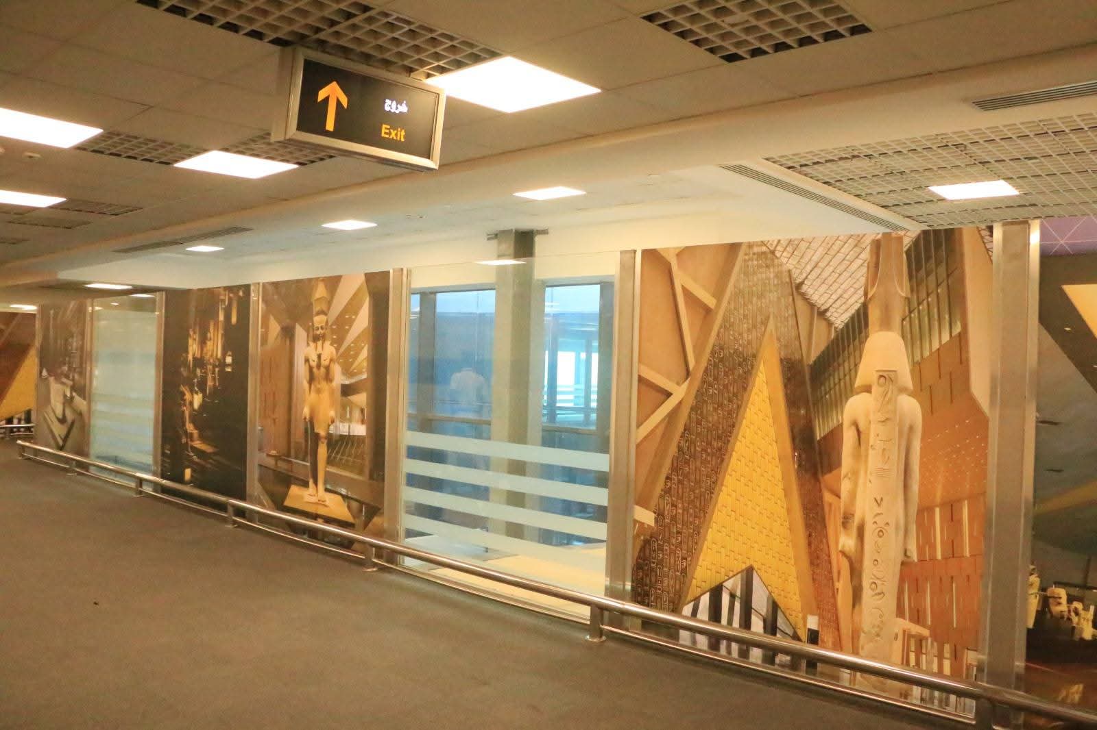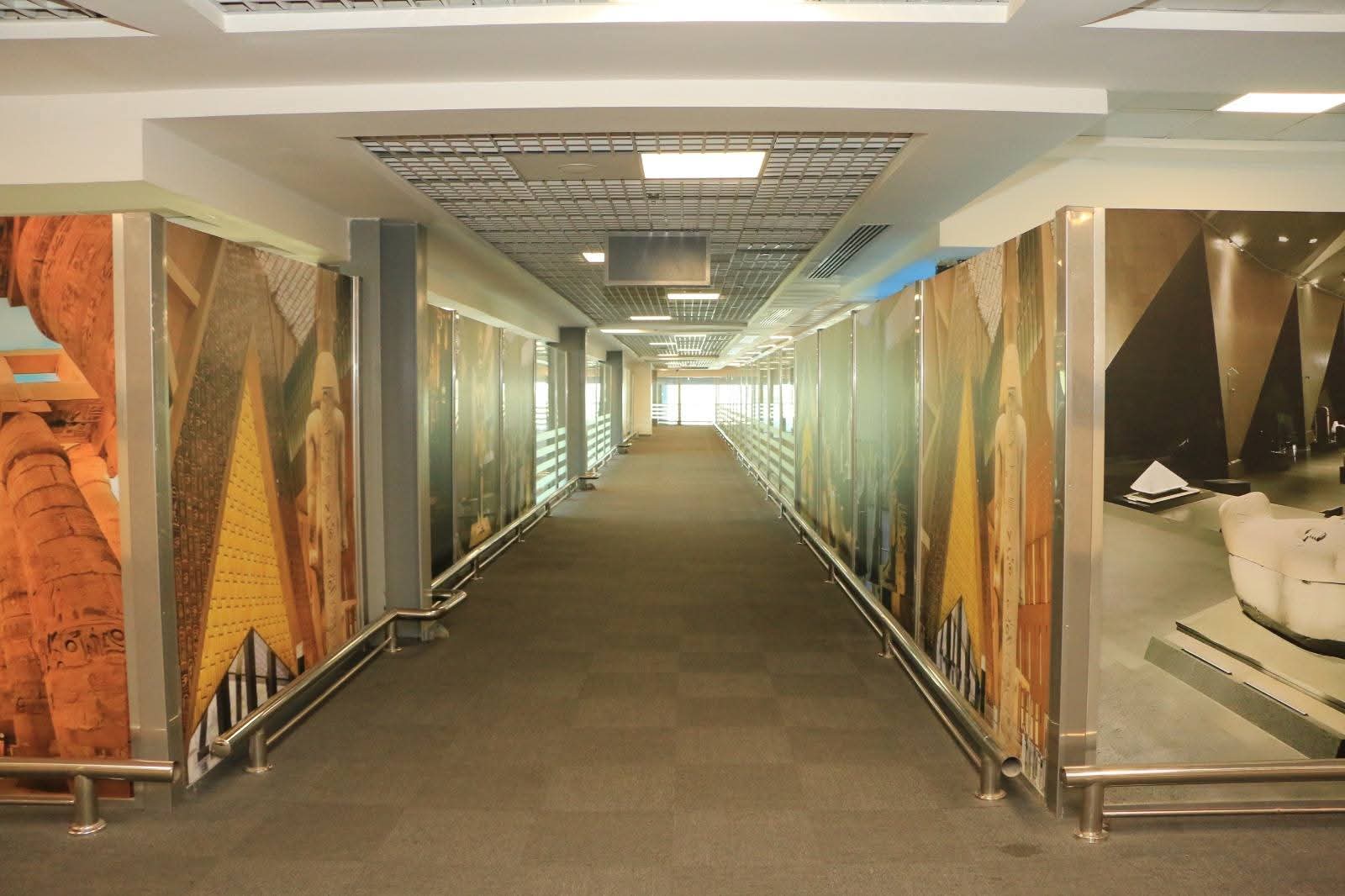 أما من الداخل، فقد اكتسب المطار طابعا جماليا مميزا يعكس روح المتحف المصري الكبير، حيث تتزين الصالات والممرات بعناصر تصميمية مستوحاة من النقوش والرموز الفرعونية، ليصبح المطار إمتدادا بصريا وثقافيا للمتحف، في لوحة تجمع بين الماضي المجيد والحاضر الحديث.