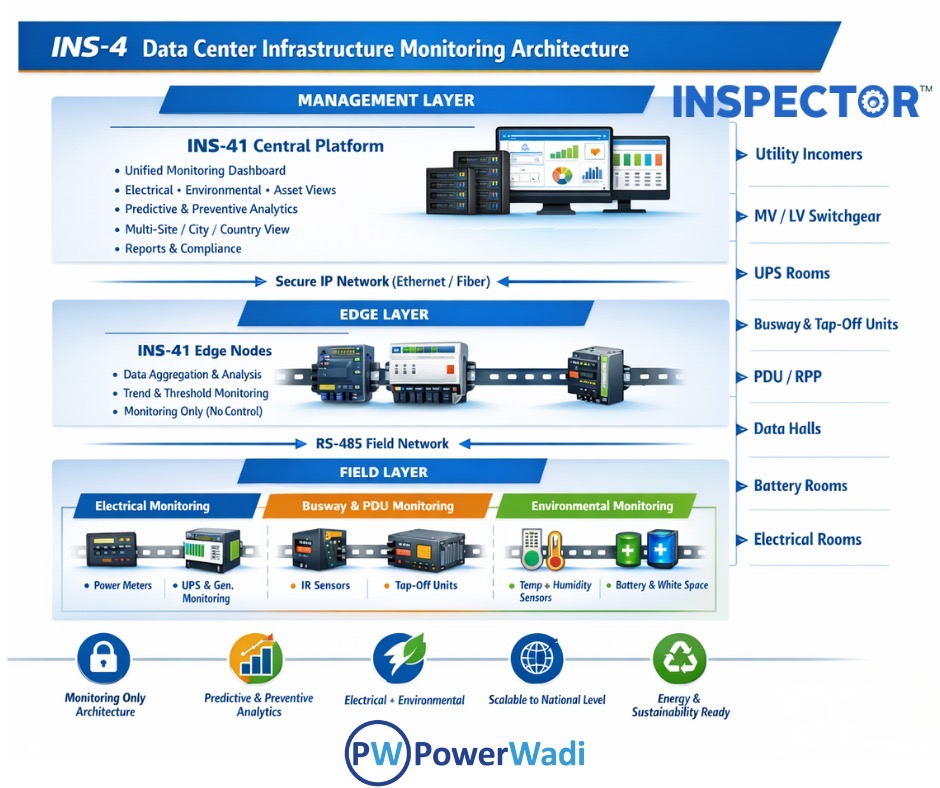 وتُعد منصة INSPECTOR نظامًا متكاملًا يعمل على مدار الساعة (24/7/365) لمراقبة جودة الطاقة، والأداء الحراري، والبيانات البيئية وجودة الهواء، بما يتيح التنبؤ بالأعطال، وتنفيذ الصيانة الوقائية، وتحسين الكفاءة التشغيلية لمراكز البيانات.