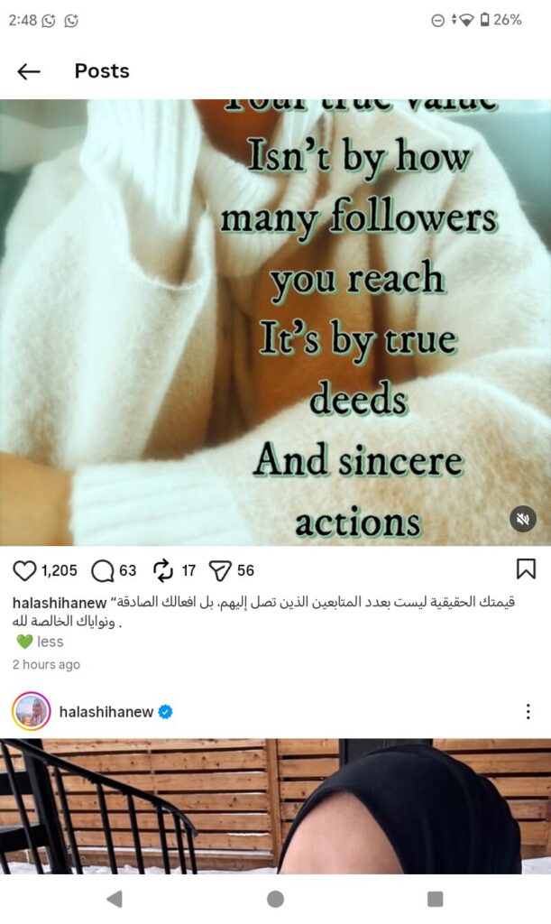 وكتبت حلا شيحة قائلة :” قيمتك الحقيقية ليست بعدد المتابعين الذين تصل إليهم، بل أفعالك الصادقة ونواياك الخالصة لله”.
