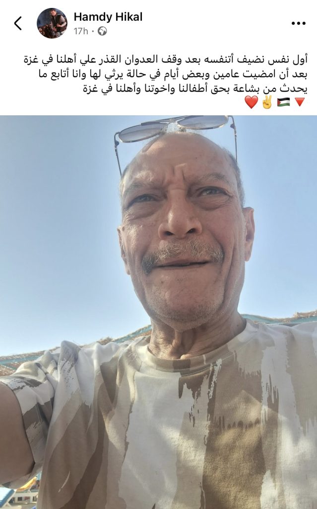 نشر الفنان حمدي هيكل، صورة له يعبر من خلالها عن مدى سعادته وشعوره بالراحة بعد إعلان وقف إطلاق النار على قطاع غزة، مؤكدًا أنه عاش خلال العامين الماضيين حالة من الألم والمعاناة النفسية بسبب ما يتعرض له الشعب الفلسطيني،وذلك عبر حسابه الرسمي بموقع التواصل الاجتماعي لتبادل الصور والفيديوهات الشهير بالفيس بوك.