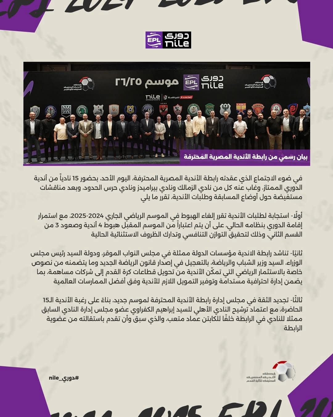 في ضوء الاجتماع الذي عقدته رابطة الأندية المصرية المحترفة، اليوم الأحد، بحضور 15 نادياً من أندية الدوري الممتاز، وغاب عنه كل من نادي الزمالك ونادي بيراميدز ونادي حرس الحدود، وبعد مناقشات مستفيضة حول أوضاع المسابقة وطلبات الأندية، تقرر ما يلي: