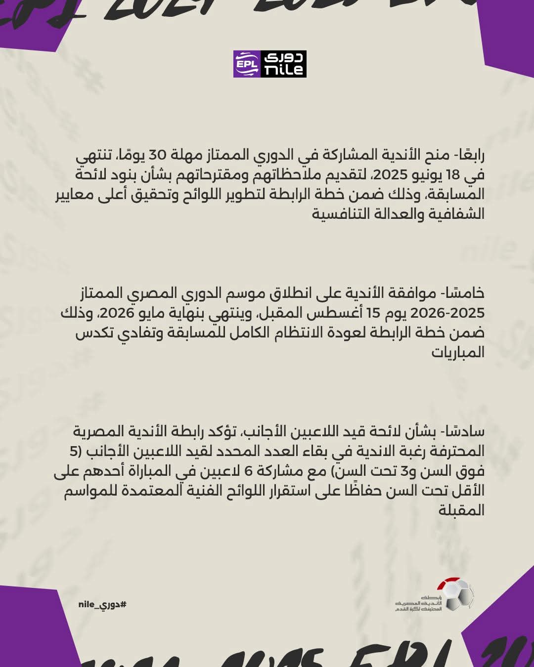 خامساً- موافقة الأندية على انطلاق موسم الدوري المصري الممتاز 2025-2026 يوم 15 أغسطس المقبل، وينتهي بنهاية مايو 2026، وذلك ضمن خطة الرابطة لعودة الانتظام الكامل للمسابقة وتفادي تكدس المباريات.