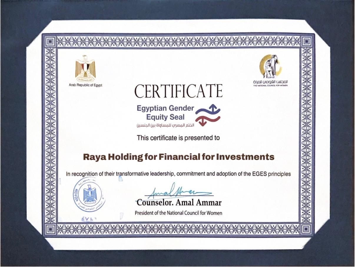 حصلت راية القابضة للاستثمارات المالية، إلى جانب خمس من شركات محفظتها: راية لخدمات تجربة العملاء، وأمان القابضة، وراية لتكنولوجيا المعلومات، وراية إلكتريك، وراية للمباني الذكية على ختم المساواة بين الجنسين المصري (EGES) الممنوح من المجلس القومي للمرأة، تقديرًا لالتزام المجموعة ببناء بيئات عمل عادلة وشاملة وداعمة.