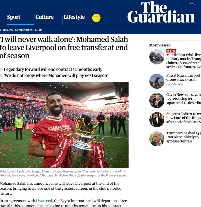 صحيفة الجارديان: وصفت الرحيل بأنه “الخاتمة المثالية” لأعظم مسيرة شهدها النادي في العصر الحديث، مؤكدة أن إرث صلاح سيظل محفورًا بغض النظر عن أي تراجعات بدنية طفيفة أو خلافات مع المدرب “آرني سلوت”.