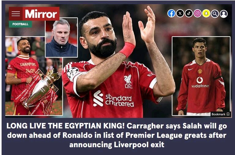 صحيفة ميرور: لخصت المشهد بعنوان عاطفي: “البريميرليج سيكون فقيرًا بدونه”، واصفة صلاح باللاعب الذي “جعل المستحيل ممكنًا” بقميص ليفربول.