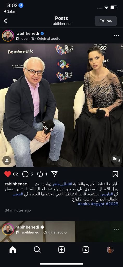 وكتب ربيع هنيدي، على الصورة له مع آمال ماهر وعلق قائلاً:” أبارك للفنانة الكبيرة والغالية آمال ماهر زواجها من رجل الأعمال المصري علي محجوب وتواجدهما حاليا لقضاء شهر العسل في باريس، وستعود قريبا لنشاطها الفني وحفلاتها الكبيرة في مصر والعالم العربي ودامت الأفراح “.