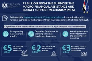 يُعد الاتحاد الأوروبي من أبرز شركاء التنمية الداعمين للموازنة العامة للدولة، حيث تبلغ قيمة آلية مساندة الاقتصاد الكلي ودعم الموازنة المقدمة لمصر 5 مليارات يورو، تشمل مرحلة أولى بقيمة مليار يورو، ومرحلة ثانية بقيمة 4 مليارات يورو، وذلك في إطار الشراكة الاستراتيجية الشاملة بين الجانبين.