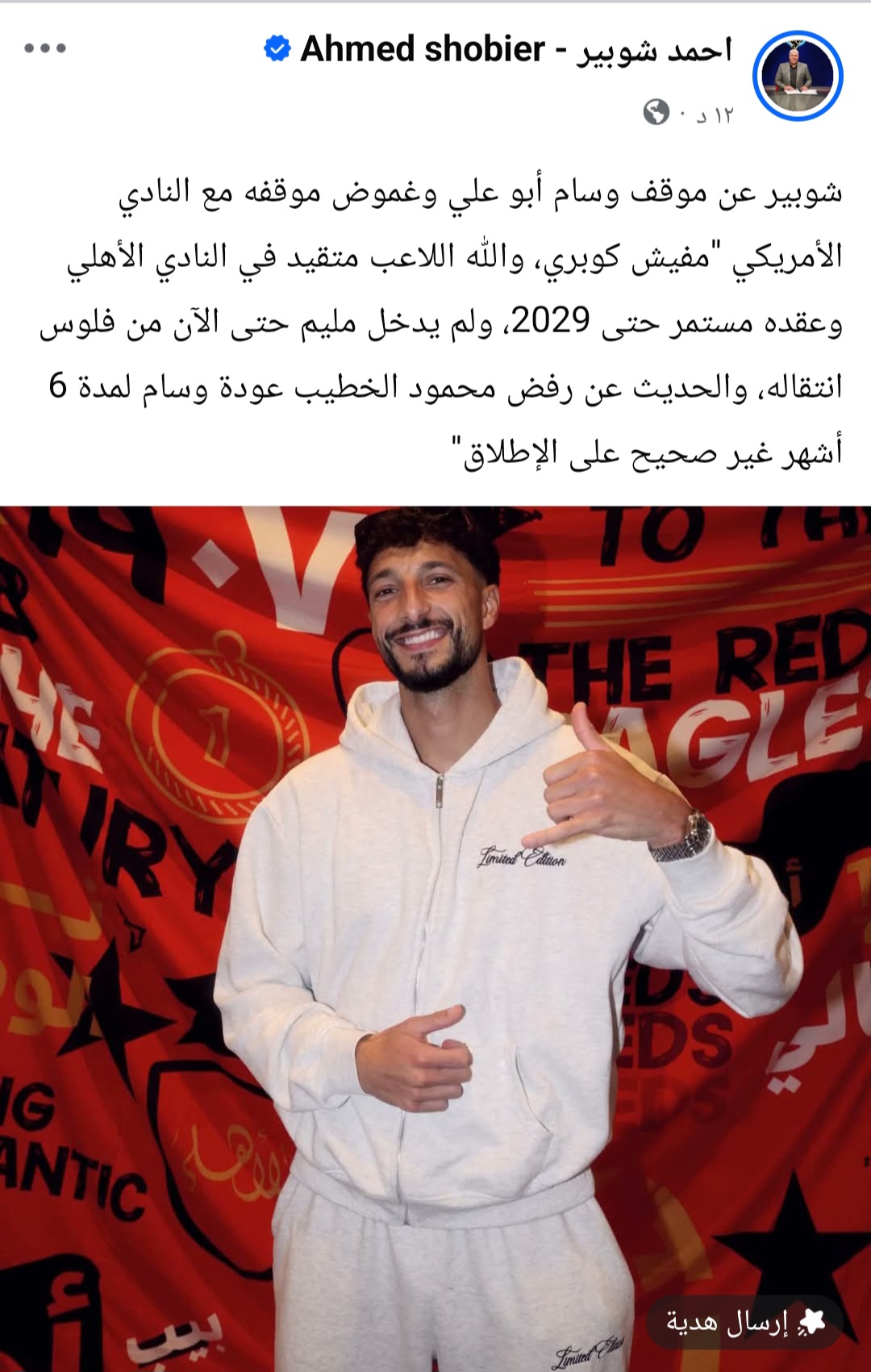 ونشر “شوبير” عبر صفحته الشخصية على موقع التواصل الإجتماعي “فيس بوك” قائلاً: عن موقف وسام أبو علي وغموض موقفه مع النادي الأمريكي ”مفيش كوبري، والله اللاعب متقيد في النادي الأهلي وعقده مستمر حتى 2029، ولم يدخل مليم حتى الآن من فلوس انتقاله، والحديث عن رفض محمود الخطيب عودة وسام لمدة 6 أشهر غير صحيح على الإطلاق”.
