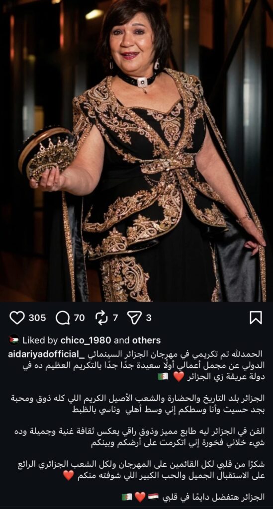 كتبت عايدة رياض، قائلة: «الحمد لله تم تكريمي في مهرجان الجزائر السينمائي الدولي عن مجمل أعمالي، سعيدة جدًا جدًا بالتكريم العظيم ده في دولة عريقة زي الجزائر».