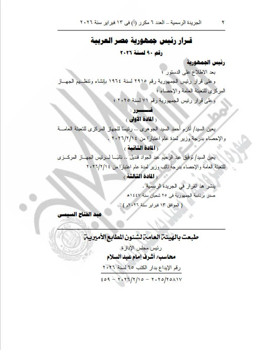 تعيين السيد/ أكرم أحمد السيد الجوهري: رئيسًا للجهاز المركزي للتعبئة العامة والإحصاء، بدرجة وزير، وذلك لمدة عام تبدأ من 14 فبراير 2026.