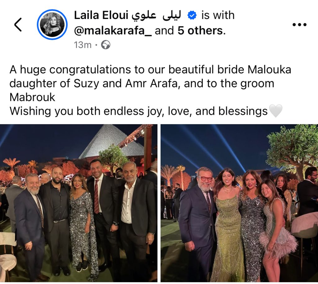 وعلقت ليلى علوي، على الصور قائلة: “ألف مبروك للعروسة ملوكا بنت سوزي وعمر عرفة، وللعريس مبروك، نتمنى لكم حياة مليئة بالفرح، الحب، والبركة”