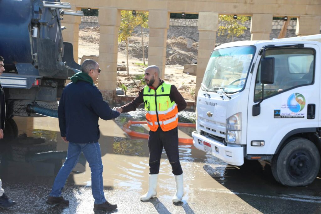 حيث تفقد عمليات تصريف المياه المتراكمة من خلال سيارات الشفط وفرق العمل التابعة للحماية المدنية، وشركة مياه الشرب والصرف الصحي والهيئة العامة للنظافة والتجميل موجهًا بتكثيف الجهود وتوفير الدعم اللازم لضمان تحقيق السيولة المرورية وانتظام حركة السيارات.