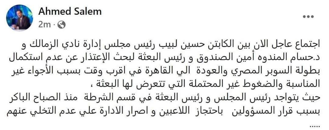 وكتب أحمد سالم قائلاً ” إجتماع عاجل الأن بين الكابتن حسين لبيب رئيس مجلس الإدارة و الدكتور حسام المندوة أمين الصندوق ورئيس البعثة لبحث الإعتذار عن عدم إستكمال بطولة السوبر المصري والعودة إلي القاهرة في أقرب وقت بسبب الأجواء غير المناسبة التي تتعرض لها البعثة، حيث يتواجد رئيس المجلس ورئيس البعثة في قسم الشرطة منذ الصباح الباكر بسبب قرار المسؤلين بإحتجاز اللاعبين وإصرار الإدارة على عدم التخلي عنهم.