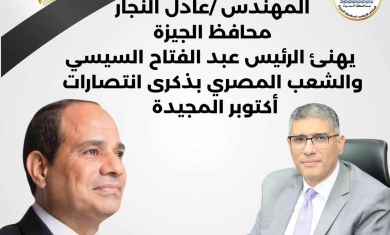 وجاء نص البرقية: “يطيب لي يا سيادة الرئيس أن أبعث لسيادتكم بخالص تهنئتي وتهنئة مواطني محافظة الجيزة وقياداتها الشعبية والتنفيذية بمناسبة انتصار أكتوبر العظيم الذي تحقق على أيدي رجال قواتنا المسلحة البواسل بما قدموه من تضحيات وبطولات شهد لها العالم أجمع، وأعاد للعسكرية المصرية وللأمة العربية عزتها وكرامتها.