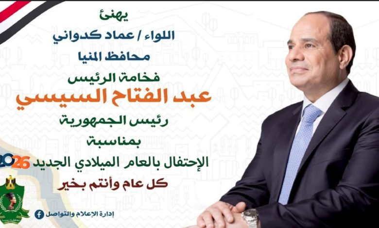 بعث اللواء عماد كدواني، محافظ المنيا، برقية تهنئة إلى فخامة الرئيس عبد الفتاح السيسي، رئيس الجمهورية والقائد الأعلى للقوات المسلحة، بمناسبة حلول العام الميلادي الجديد 2026.