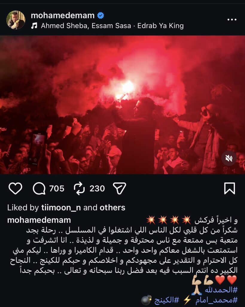 كتب محمد إمام على الصورة قائلا: “وأخيراً فركش، شكراً من كل قلبي لكل الناس اللي اشتغلوا في المسلسل .. رحلة بجد متعبة بس ممتعة مع ناس محترفة وجميلة و لذيذة”.
