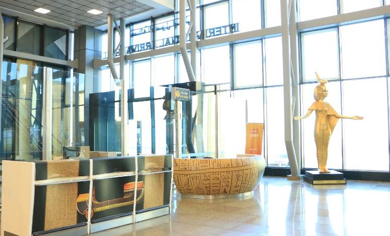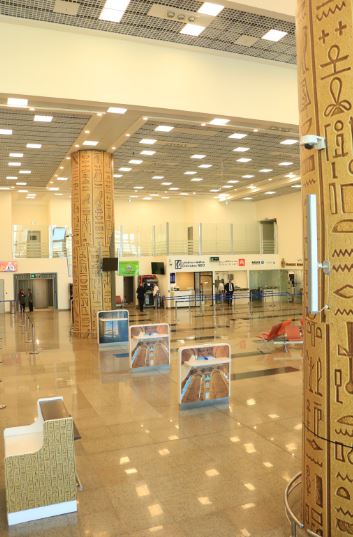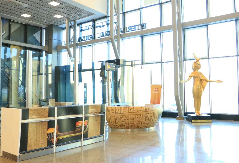 أما من الداخل، فقد اكتسب المطار طابعا جماليا مميزا يعكس روح المتحف المصري الكبير، حيث تتزين الصالات والممرات بعناصر تصميمية مستوحاة من النقوش والرموز الفرعونية، ليصبح المطار إمتدادا بصريا وثقافيا للمتحف، في لوحة تجمع بين الماضي المجيد والحاضر الحديث.