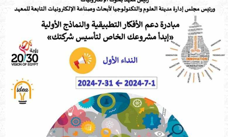 أطلق معهد بحوث الإلكترونيات برئاسة الدكتورة شيرين محرم رئيس المعهد ورئيس مجلس إدارة مدينة العلوم والتكنولوجيا لأبحاث وصناعة الإلكترونيات، النداء الأول بعنوان: “ابدأ مشروعك الخاص لتأسيس شركتك”، وذلك في إطار المُبادرة التي اطلقها المعهد؛ لدعم الأفكار التطبيقية والنماذج الأولية”.