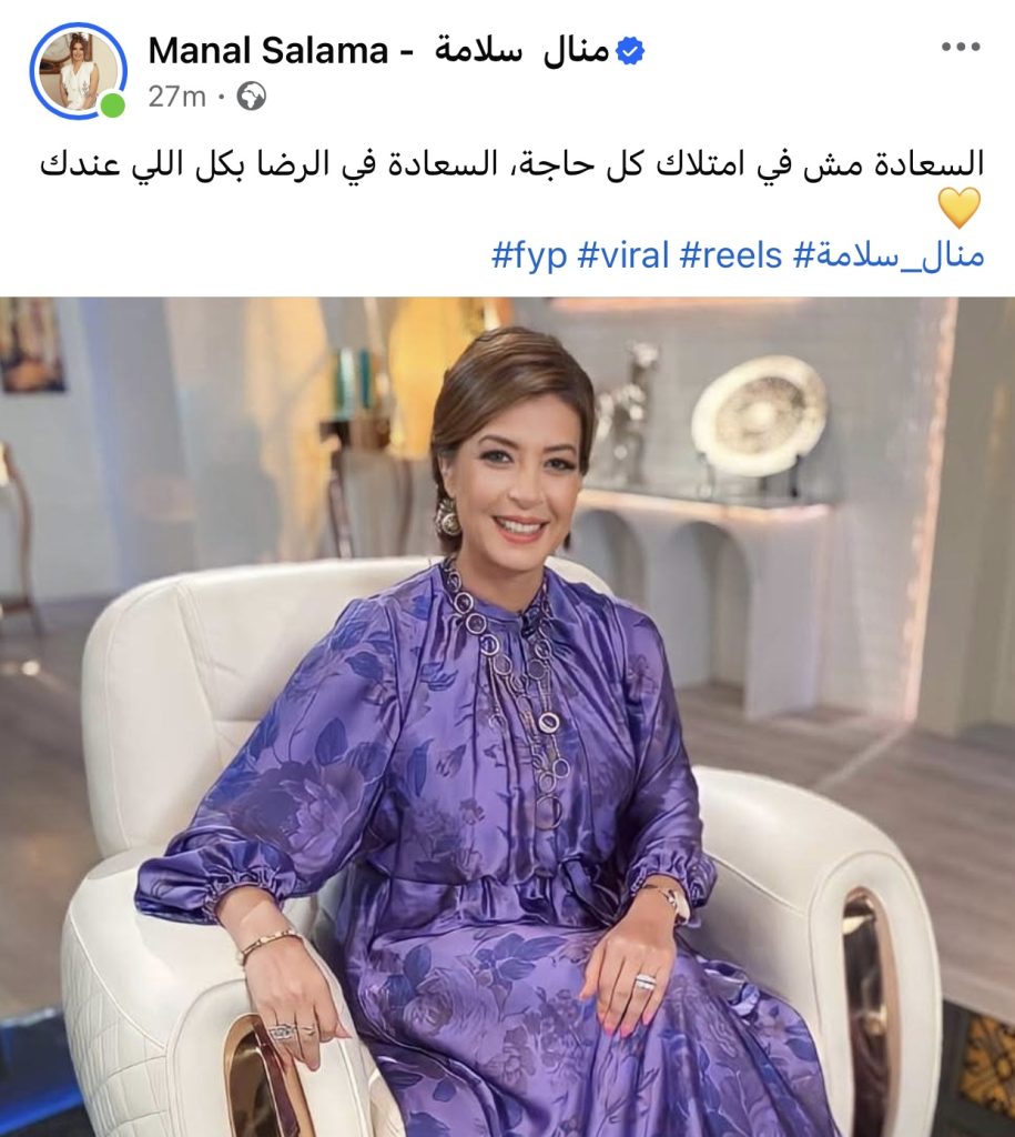 حرصت الفنانة منال سلامة، على مشاركة متابعيها وجمهورها بنشر صورة من أحدث ظهور بإطلالة موف أنيقة ،وذلك عبر مع صفحتها الشخصية على موقع التواصل الاجتماعي لتبادل الصور والفيديوهات الشهير بالفيس بوك، مؤكدة على أهمية الرضا للتوصل إلى السعادة.