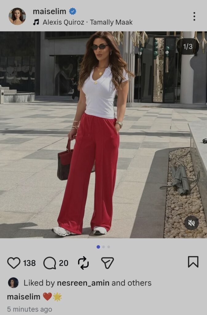 وظهرت مي سليم، في الصورة بإطلالة صيفية مبهجة حيث أرتدات تيشيرت باللون الأبيض ونسقت معه بنطلون أحمر، لتكشف عن جمالها وقوامها المشدود.