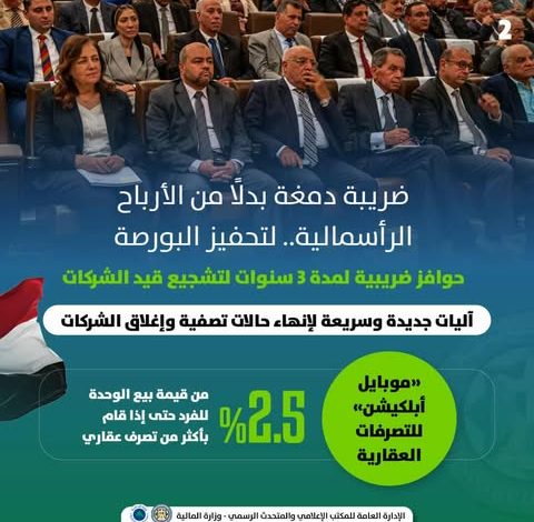 أشار إلى أنه سيكون هناك منظومة إلكترونية لسرعة وتبسيط إجراءات التعامل مع حالات تصفية وإغلاق الشركات في أسرع وقت ممكن، لافتًا إلى أنه سيكون لدينا أيضًا «موبايل أبليكشن» للتصرفات العقارية يسمح بالإخطار وسداد قيمة الضريبة المستحقة بسهولة ودون أى تعقيدات، فضلاً على إقرار ضريبة ٢,٥٪ من قيمة بيع الوحدة للشخص حتى إذا قام بأكثر من تصرف عقاري.
