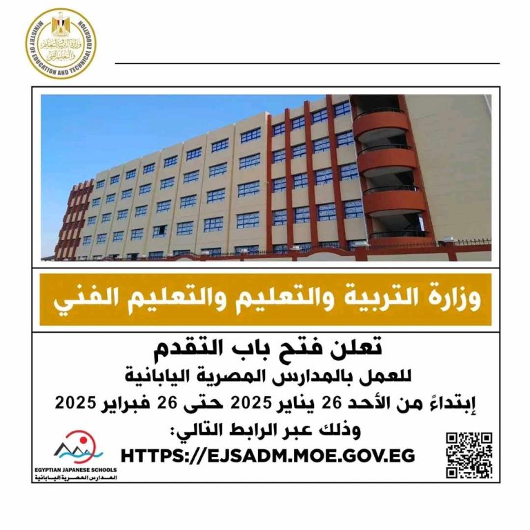 أعلنت وزارة التربية والتعليم والتعليم الفني، عن فتح باب التقدم للعمل بالمدارس المصرية اليابانية، إبتداءً من اليوم الأحد الموافق ٢٦ يناير ٢٠٢٥ ولمدة شهر، وذلك...