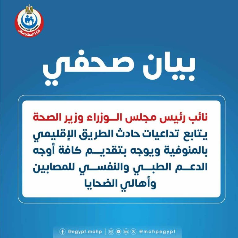 تابع الدكتور خالد عبدالغفار، نائب رئيس مجلس الوزراء، وزير الصحة والسكان، تداعيات الحادث المؤسف الذي وقع اليوم السبت، على الطريق الإقليمي (اتجاه القاهرة – الإسكندرية...