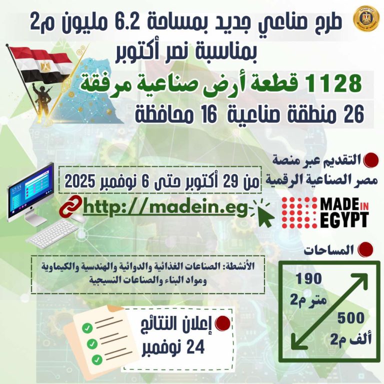 طرح 1128 قطعة أرض صناعية جديدة بمساحة 6.2 مليون متر لدعم المستثمرين وتوسيع النشاط الصناعي