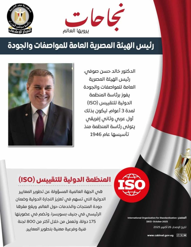 في إنجاز غير مسبوق يُضاف إلى سجل النجاحات المصرية على الساحة الدولية، تسلمت مصر رئاسة المنظمة الدولية للتقييس (ISO) لمدة ثلاث سنوات تبدأ من يناير...