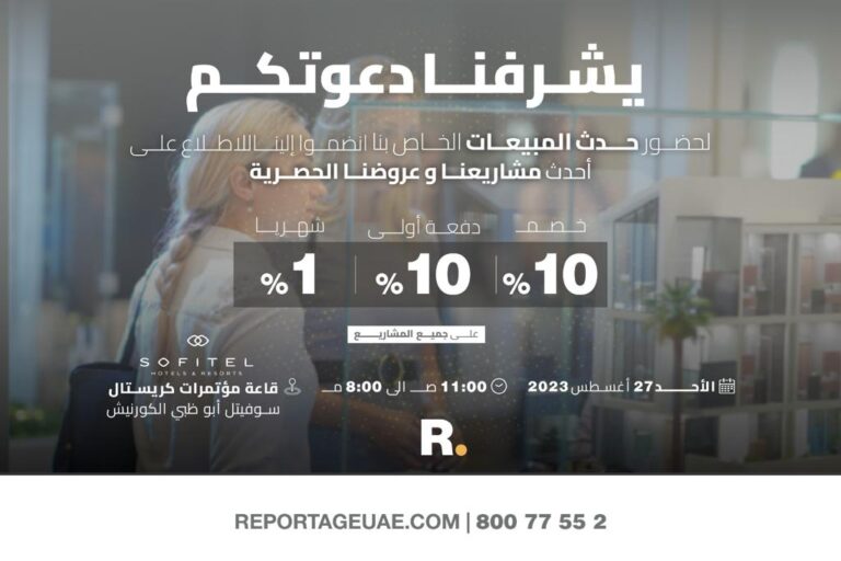 تنظم ريبورتاج العقارية، الشركة الرائدة في مجال التطوير العقاري بالإمارات، يوما خاصا للمبيعات، في فندق سوفيتيل أبوظبي الكورنيش، يوم الأحد المقبل، الموافق 27 أغسطس الحالي....