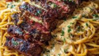 اسباجيتي بالجبنة والثوم مع شرائح لحم مشوية بطريقة شهية