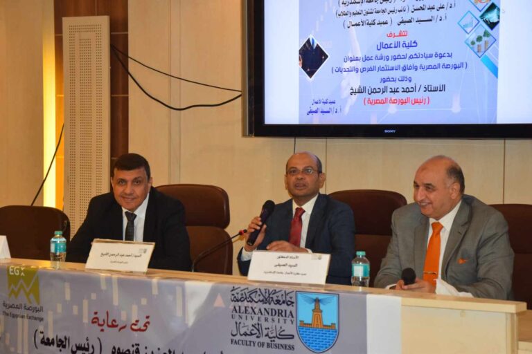 شارك أحمد الشيخ – رئيس البورصة المصرية كمتحدث رئيسي في ورشة عمل نظمتها كلية الأعمال بجامعة الإسكندرية بعنوان “أسواق المال وآليات الاستثمار في...