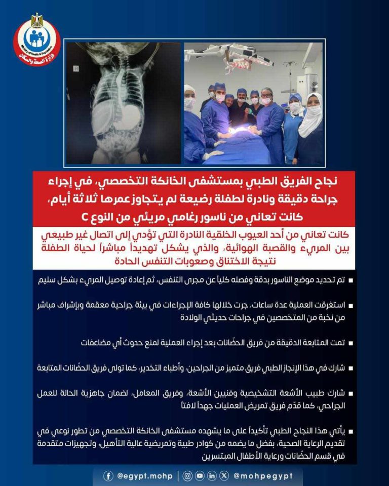 صرح المتحدث الرسمي لوزارة الصحة والسكان، الدكتور حسام عبد الغفار، بأن الفريق الطبي بمستشفى الخانكة التخصصي نجح في إجراء جراحة دقيقة ونادرة لرضيعة تبلغ من...
